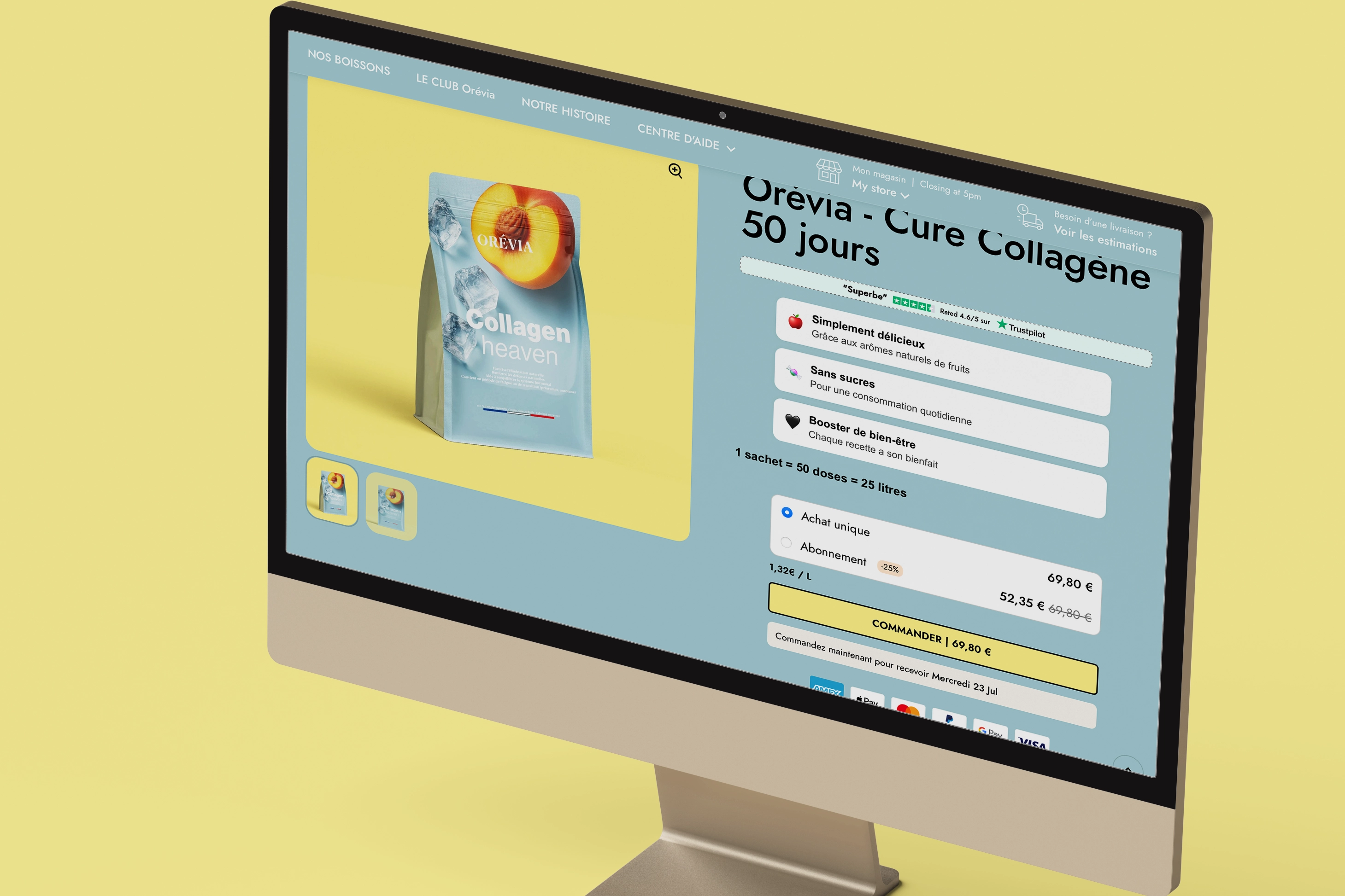Réinventer l'identité visuelle et l'expérience Shopify d'Orevia en brisant les codes traditionnels de l'anti-âge au profit d'un univers frais et optimiste.